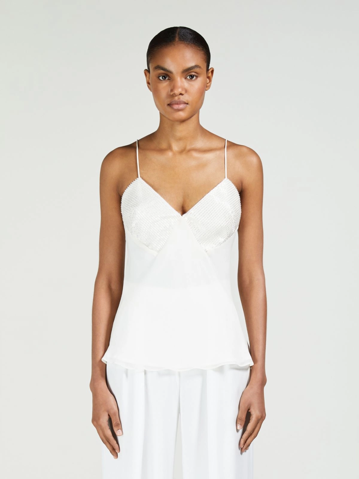 Top sin mangas inspirado en los vestidos slip, adornado con copas bordadas con hilos metálicos a tono.