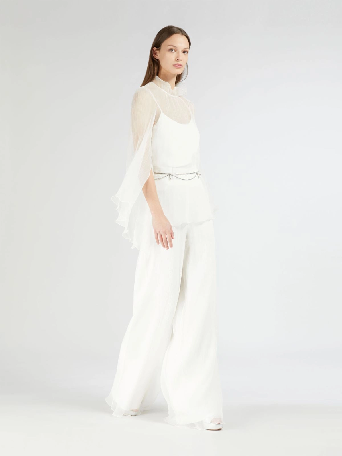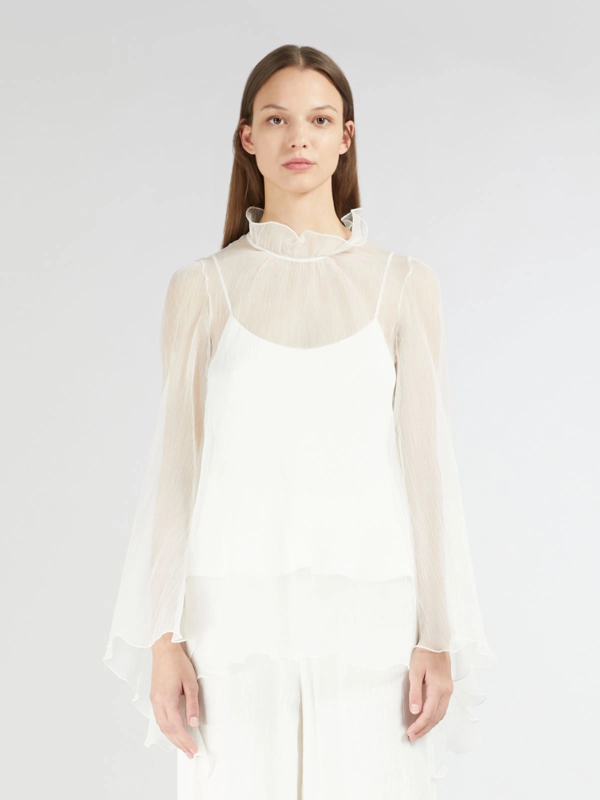 Blusa con cuello subido ligeramente fruncido efecto volantes y con dobladillos pequeños enrollados de efecto ondulado.
